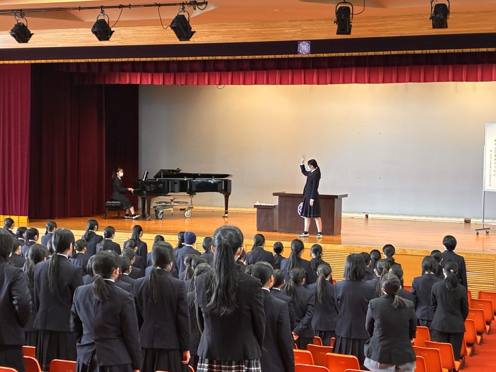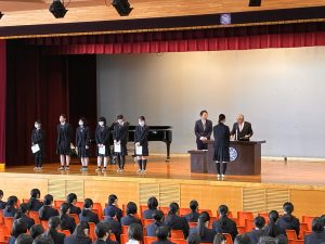 3年生の指揮者・伴奏者から2年生の代表生徒に引き継がれ、校歌斉唱で式が始まりました。