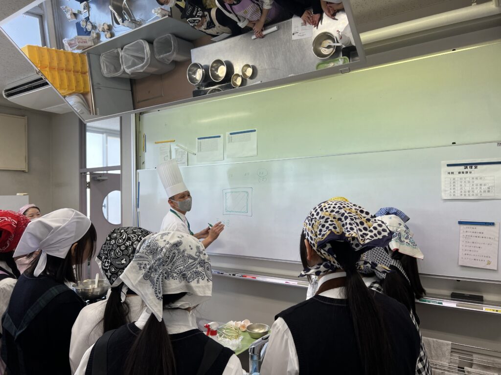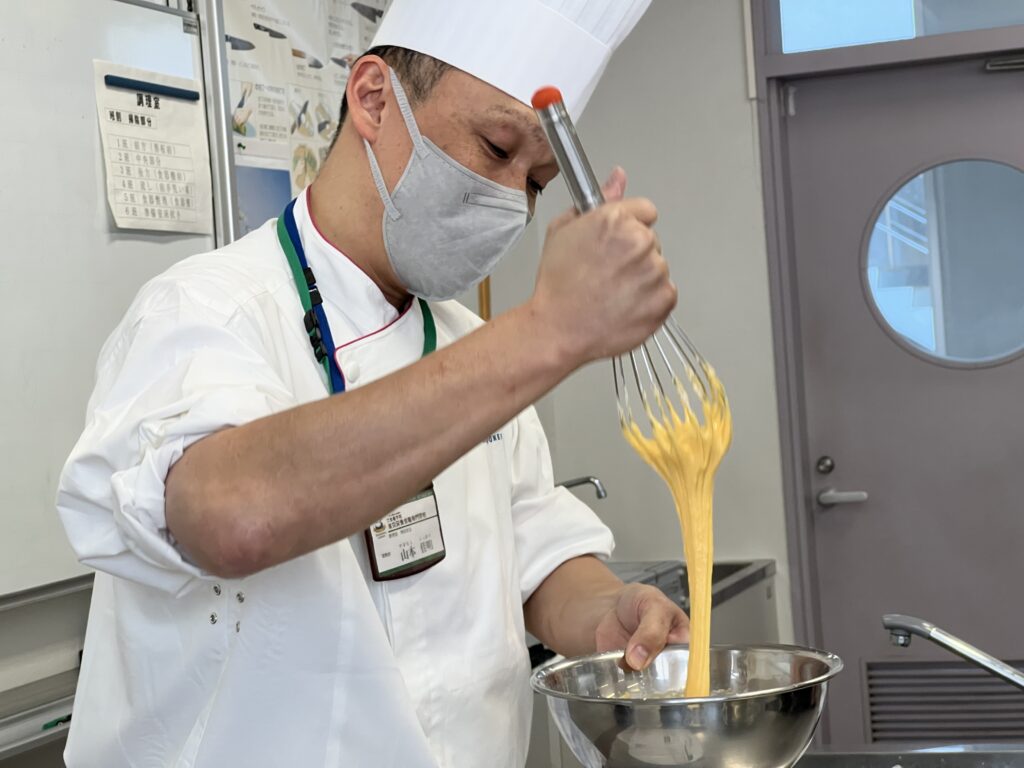 また東京栄養食糧専門学校/東京調理製菓専門学校でご指導されている山本先生、金子先生をお招きしました。材料に使われている素材の知識からロールケーキを作る際のポイントも一つ一つ丁寧に教えてくれました。