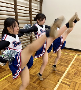 春は、新入生歓迎フェスタ・体育大会入場行進、夏~秋は文華祭の舞台発表や西東京市市民パレードの出場に向けて練習を行っています。活動日:週3回一年を通して発表できるイベントが多くあります。部員は皆仲良く部活動に励んでいます。未経験者でも、ステップやバトンの持ち方から教わって舞台で踊れるようになります。バトンの他にもポンポンや旗を使って踊ります。