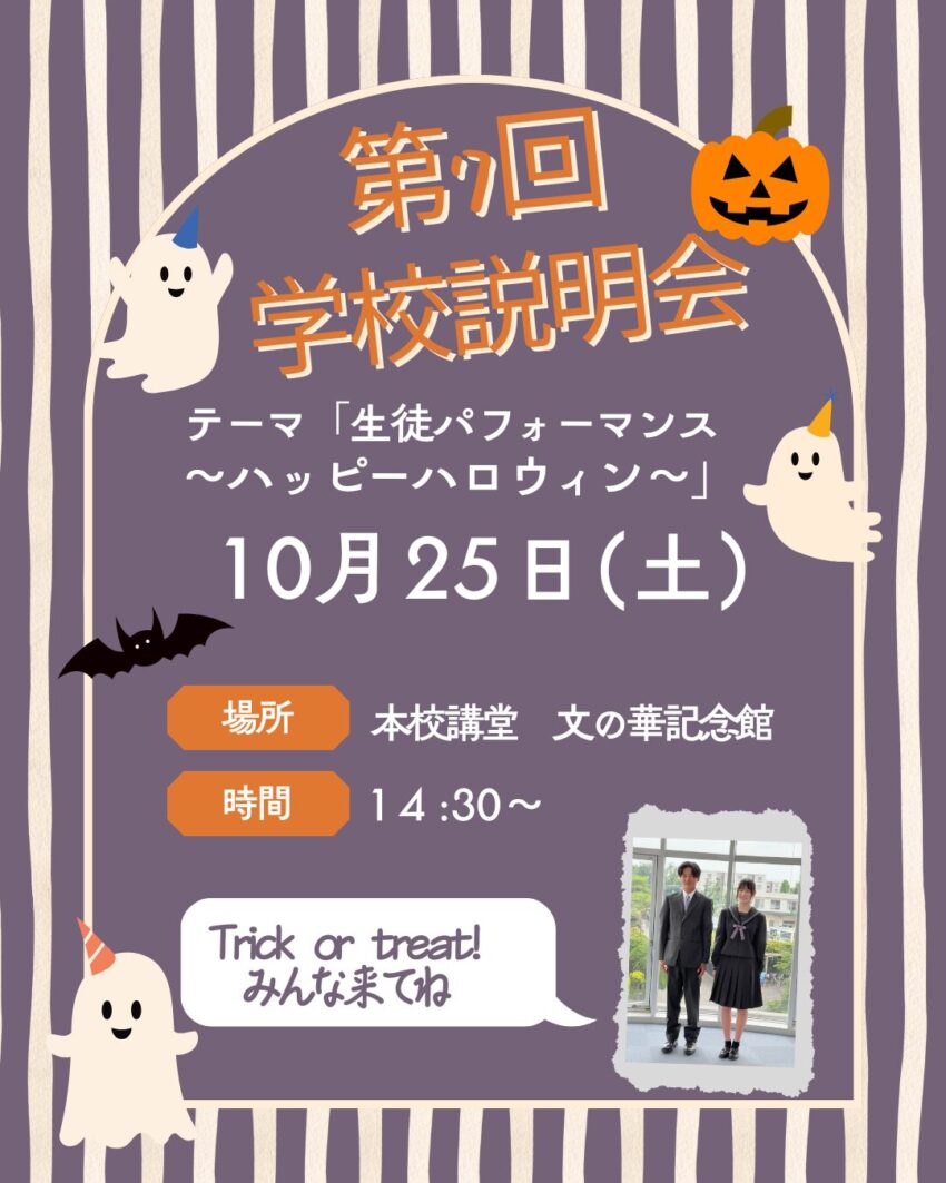 10月25日(土)第7回学校説明会 受付中2025.10.15.Wed入試情報 10月25日(土)14:30~ 第7回学校説明会が開催されます。今回のテーマ「生徒パフォーマンス ~ハッピーハロウィン~ 」です。本校でのハロウィンウイークの授業は普段とはひと味違い、英語が大好き、苦手でも楽しめるトリックがいっぱいです。その様子が垣間見れる会となっております。ぜひ、この機会にお越しください。説明会後には校舎見学、個別相談もできます。 申込はこちら